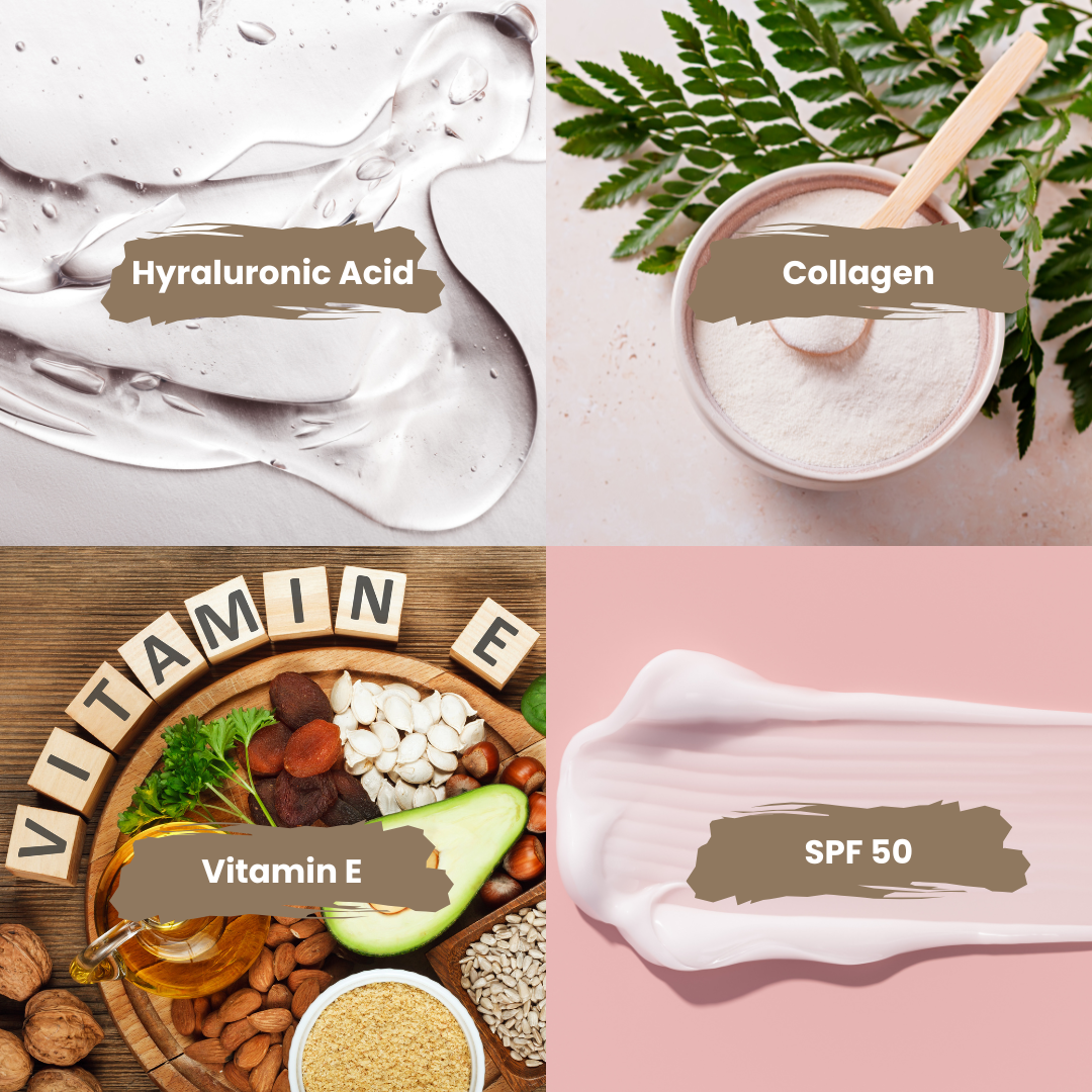 titanium dioxide, trimethypentapheny-trisiloxane, glycerol isostearate,polyglycerol-2 oleate, cetyl PEG/P.PG-10/1 plydimetysiloxane, magne-sium sulfate, magnesium stearate,tinethliloysilane, propylene glycol,p-hydroxyacetophenone, polydimethyl-siloxane/vinyl polydimethylsiloxane crosslinked polymer, aluminum oxide,silica Other trace ingredients; C177492,triethoxyoctylsilane, (daily) essence,octanyl Hydroxamic acid, butylated hydroxytoluene, C177491 Glyceroloctanoate ester, glycerol polyether-26,sodium hyaluronate, Tremella fuciformis polysaccharide, panthenol, CRAMBE ABYSSINICA seed oil, allantoin,trehalose, 1.2-pentanediol, sodium hyaluronate cross-linked polymer,1,2-hexanediol, arginine, sodium chloride, soluble collagen.